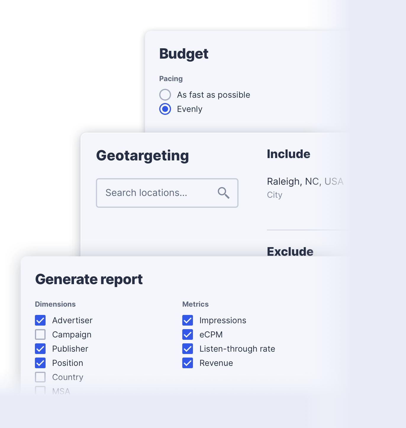 From setting up your slate of advertisers to analyzing performance with unique metrics like listen-through rate, running every aspect of your direct-sold campaign has never been simpler.